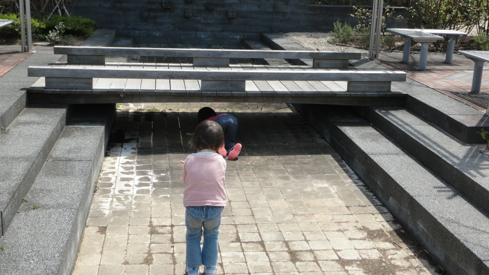 夏場は水があると思われる橋の下をハイハイして通る二人。