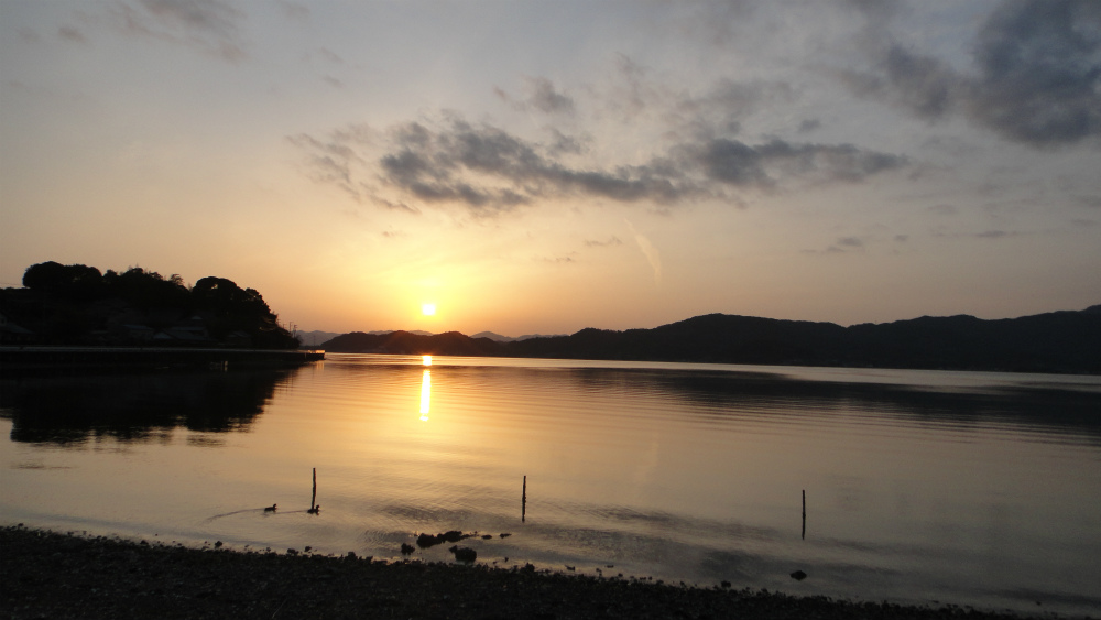 外に出たら夕日が水面に映し出されていました。